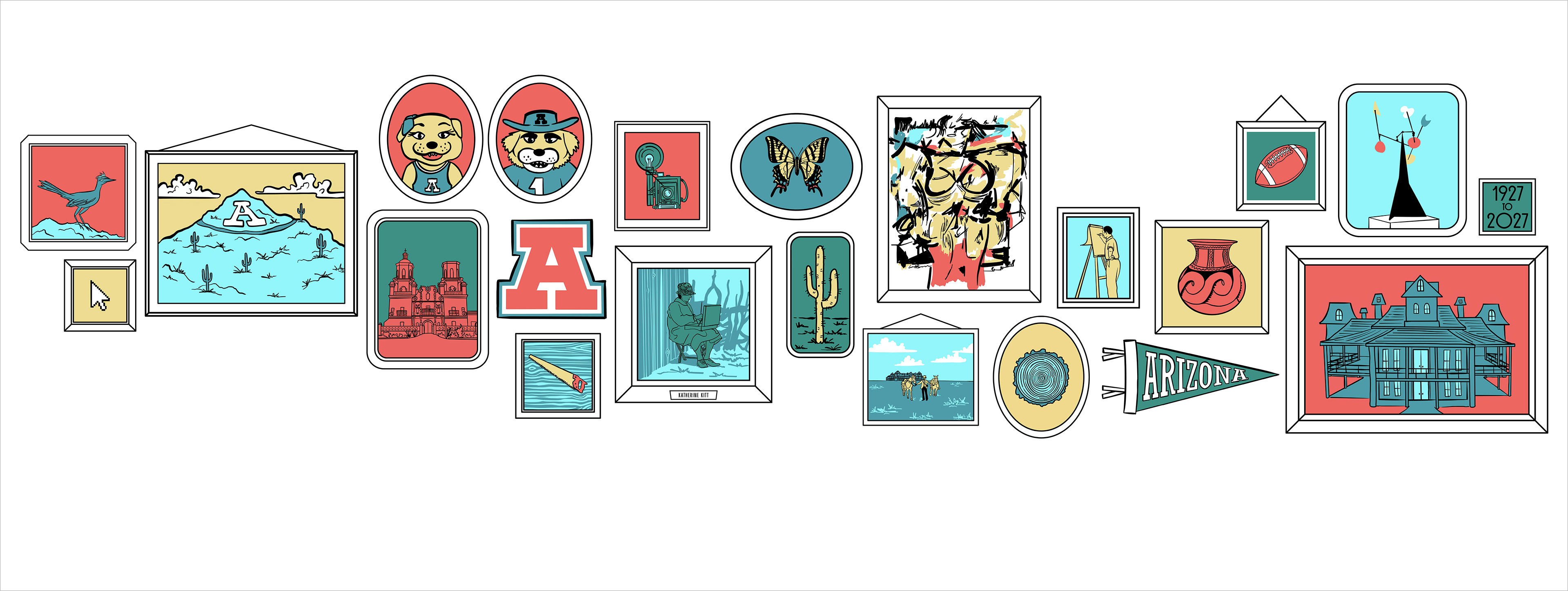 A mural design proposed to celebrate 100 years of the UofA School of Art. The style is inspired by 50s cartoon illustration, as the building was constructed in the 1950s. Each "frame" pays homage to a different element of the School of Art and the University.